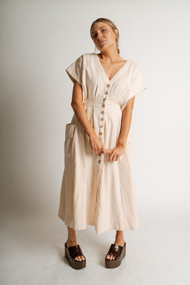 GARMENT DETAILS: Mid-length, woven linen fabrication, v-neck button down, open back, short sleeves, elastic waistband and side pockets.