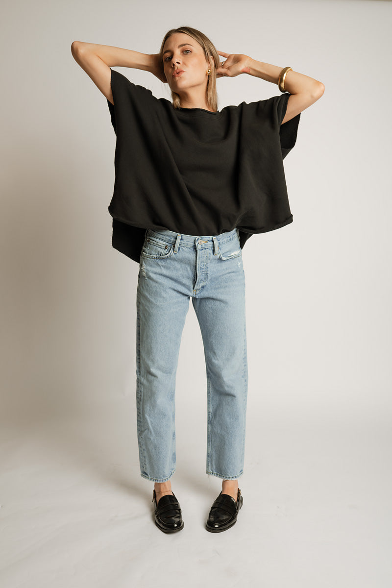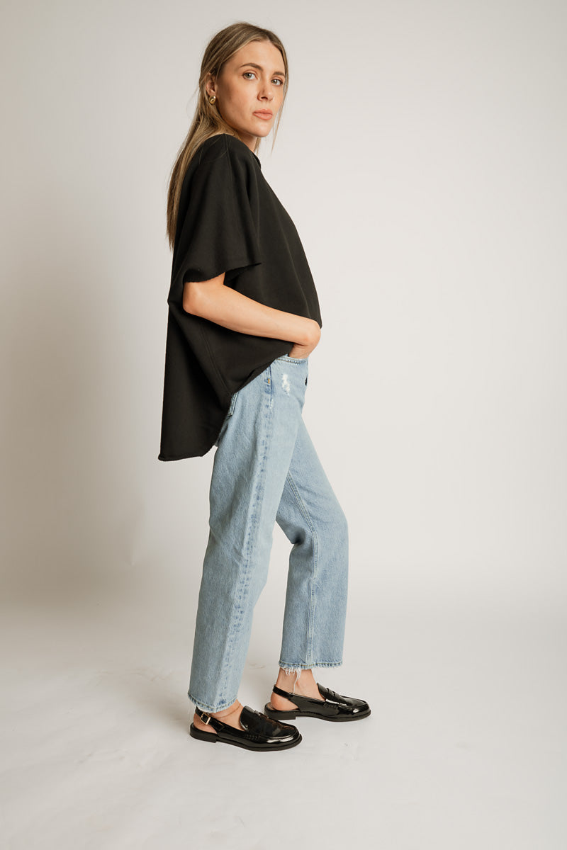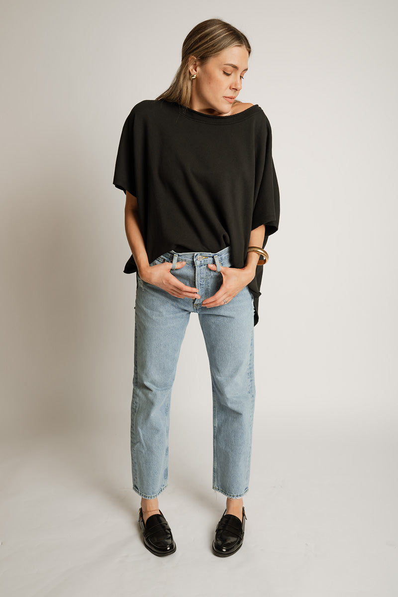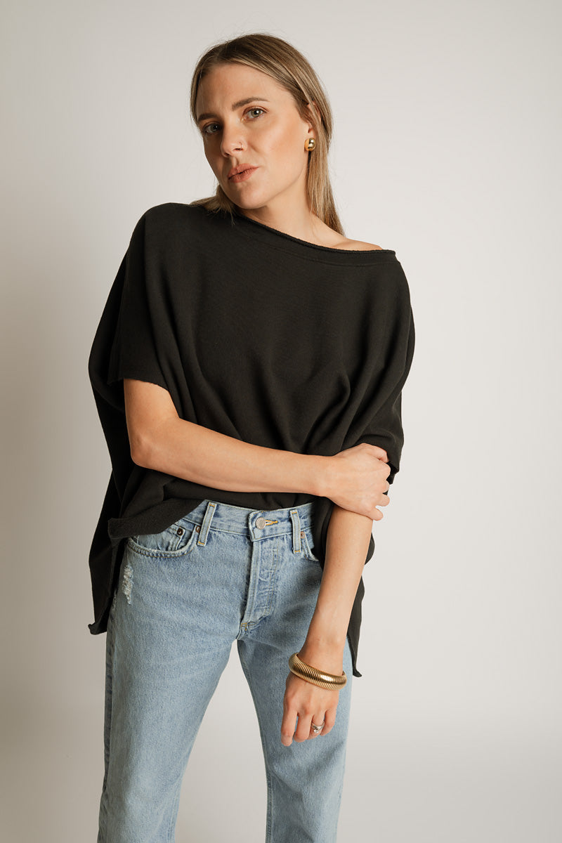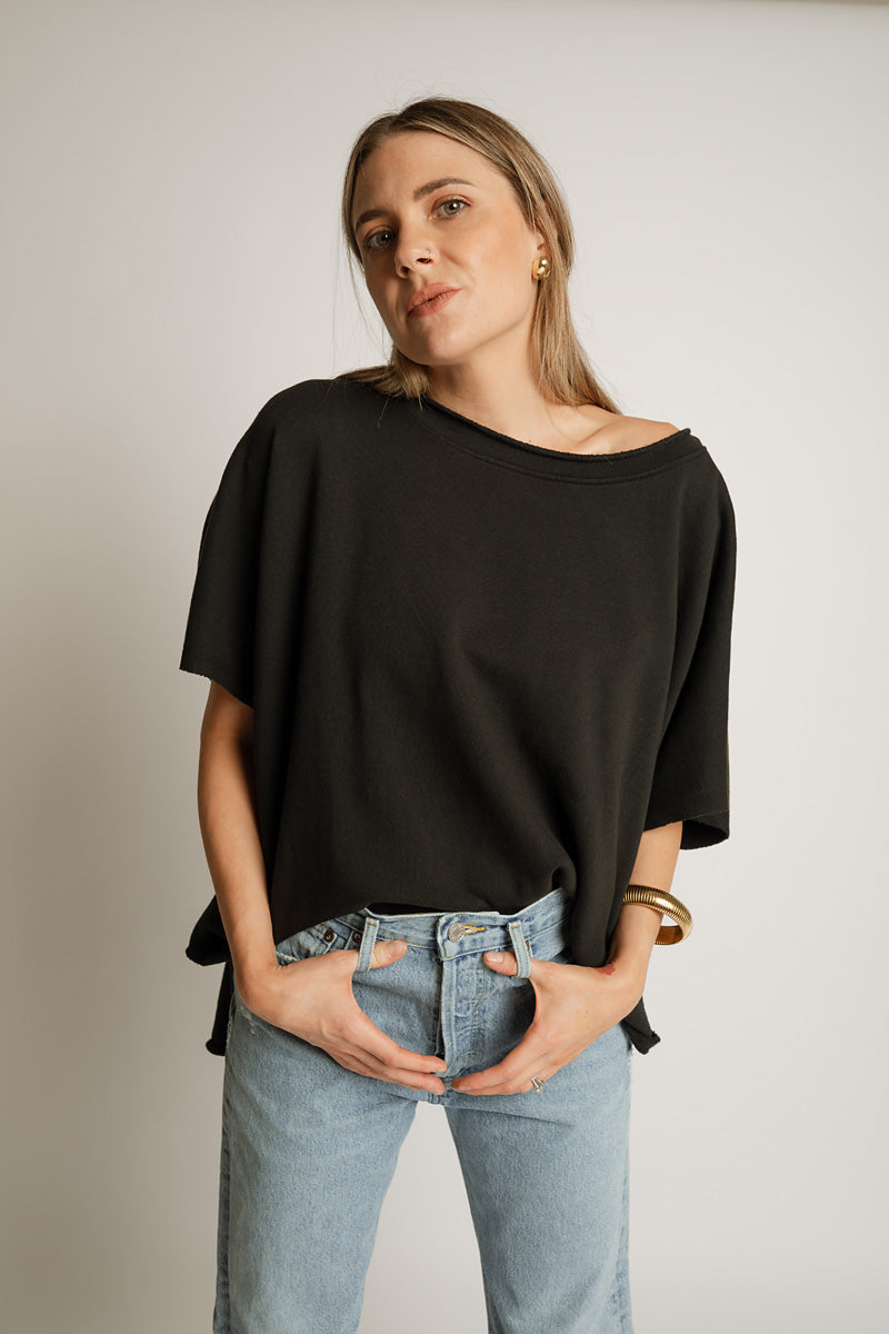 GARMENT DETAILS: Garment washed fabrication, relaxed fit and slight boatneck.