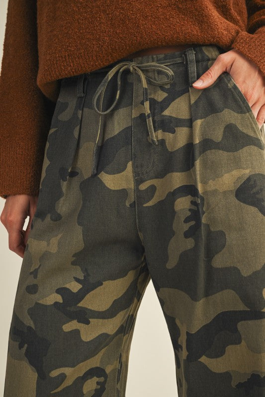 GARMENT DETAILS: Camo printed fabrication, front tie, back elastic and pockets.