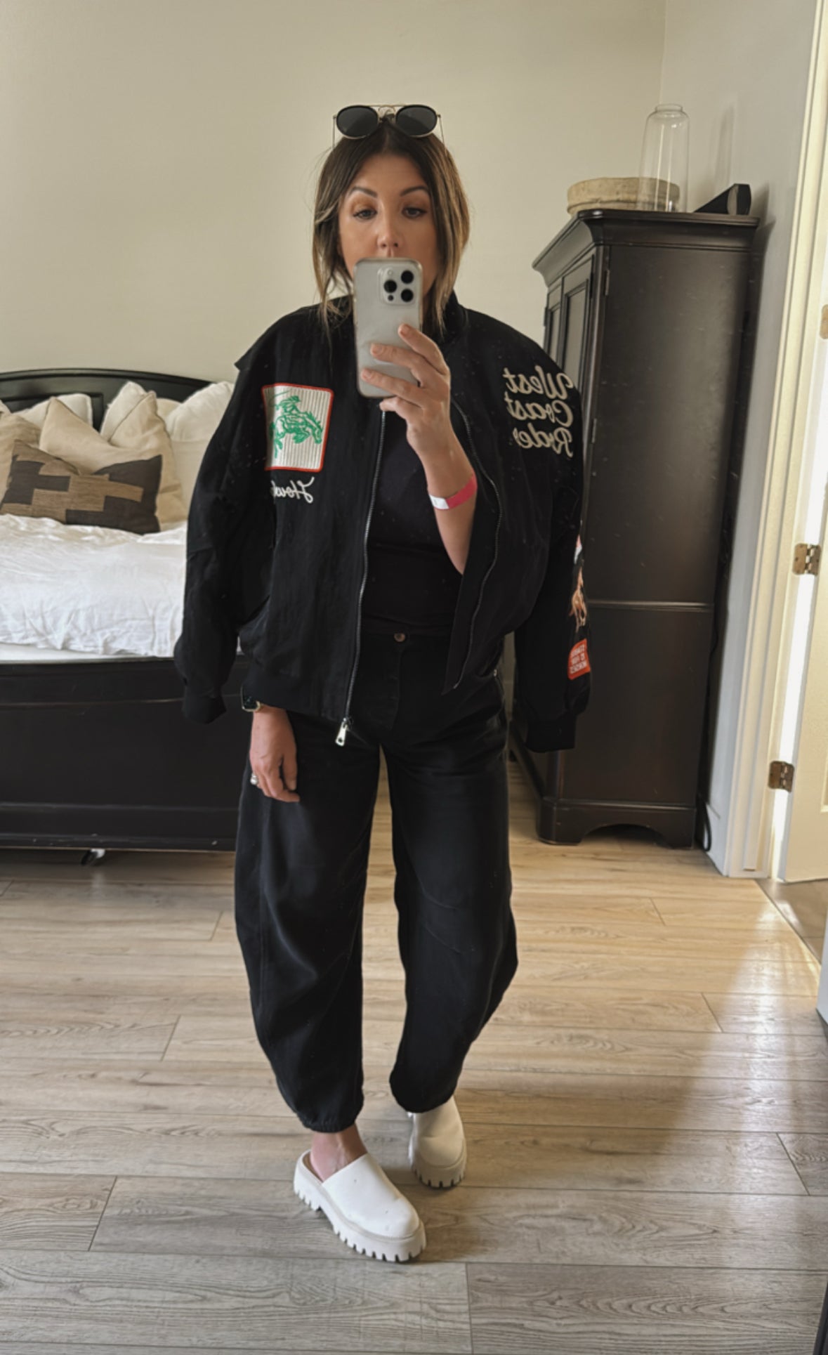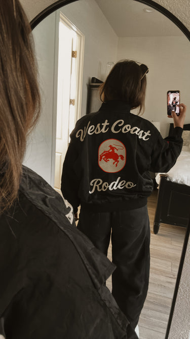 GARMENT DETAILS: Western-inspired bomber jacket with bold cowboy embroidery and "West Coast Rodeo" lettering. Lightweight nylon shell with ribbed cuffs + hem, zip front, side pockets, + sleeve pocket.